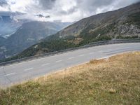 This stock photo features a motorcycle rider cruising down a winding asphalt road in the highlands of Austria. The scenic landscape showcases majestic mountains in the distance, creating a picturesque view. The image captures a vibrant day with clear skies and fluffy clouds. Surrounded by nature, trees, and serene lakes, the road follows a gentle slope. A sturdy guard rail and an Armco barrier ensure safety on the elevated road. The rural and highland setting provides a tranquil and adventurous atmosphere. Experience the beauty of Europe as you imagine yourself cruising along this stunning road.