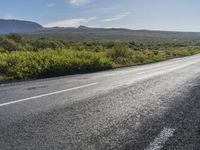 a black and white motorcycle is on the road by bushes and a field with mountains
