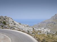 a person rides a red motorcycle down a winding road with mountains in the background under a blue sky