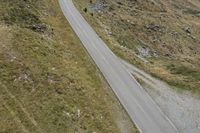 Two motorcycles are traveling down a scenic road beside majestic mountain peaks in a mountainous area in Europe. The road surface is smooth asphalt, winding through beautiful countryside and offering breathtaking views of the landscape. The motorcycles are surrounded by lush green grass and stunning geological formations. This aerial view captures the serpentine S-curve of the road as it blends seamlessly into the natural surroundings. It's a perfect representation of the beauty of Europe's mountains and the joy of a road trip.