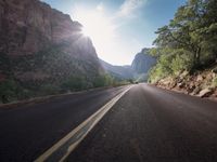 an empty road on a mountain side with trees on both sides of the road and a sun shine behind