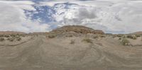 A rugged mountain rises from the desert landscape in California, with a white cloud floating in the open sky. The rocky terrain and dry riverbeds create a unique natural environment.
