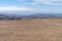 Barren desert landscape on a mountain slope. Unpaved surface of sand and gravel creates an open space. Overlooking a horizon with a mountain range in the distance. A serene and untouched view of nature.