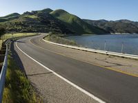 This is an image of a scenic coastal road in California, USA. The road winds through a lush landscape with mountains, forests, and a clear blue sky above. The asphalt road surface curves along the coastline, with the sparkling ocean and a river visible in the distance. Guard rails and Armco barriers line the road to provide safety. This photo captures the beauty of nature and the infrastructure that connects the coastal areas of California. It is a perfect representation of a picturesque day on this scenic highway.