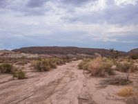 A view of a rugged off-road track in the California desert. The landscape is dominated by sand, dirt, and bedrock formations. Vegetation is sparse, and a dry riverbed can be seen. The gloomy grey sky adds to the desolate atmosphere.
