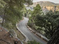 This is an aerial view of an elevated road in Mallorca, Spain. The road, made of asphalt, winds through the mountainous landscape, creating curves and S-curves. The clear sky and top-down perspective offer a stunning view of the surrounding nature and the canyon below. This photo showcases the high and elevated roads of Mallorca, a beautiful island in the Balearic Islands. It represents the stunning landscapes and natural beauty of this European destination.