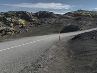 A motorcyclist rides down a winding mountain road in Iceland, surrounded by rugged coastal terrain and clear skies. The road surface contrasts with the rocky landscape and lush grass. A perfect day for an adventure in Europe's highlands.
