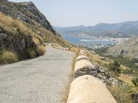 A scenic road in Mallorca, Balearic Islands, Spain winds through the mountains. The asphalt road offers breathtaking views of the highlands, hills, and coastal areas. Clear skies and Armco barriers add to the safety and beauty of the landscape.