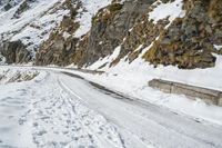 This image captures a breathtaking winter landscape in Italy, Europe. The photo shows a person on skis riding on a snow road near the top of a mountain, with a rocky cliff on one side. The terrain is covered in snow, reflecting the freezing temperatures. The road curves through the mountain, providing an adventurous and scenic journey. The lush wood and garden add a touch of nature to the scene. This photo represents the beauty and thrill of winter sports in the highlands of Italy.