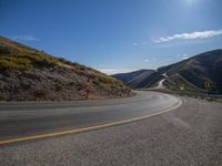 This is an image of a lone highway that stretches along the edge of a mountain side. The road surface is made of tar and asphalt, smoothly curving along the slope of the highland landscape. There are no signs of any other vegetation, giving a sense of isolation and tranquility. The clear blue sky above contrasts with the yellow line running down the middle of the road. This photo captures the beauty of nature in the mountains, where the road blends seamlessly with the surroundings.