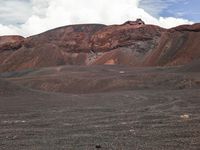 A stunning landscape of open space and mountain formations. The brown terrain, covered in gravel and dirt, leads to a track surrounded by highlands. Clouds hover over the mountainous surface.