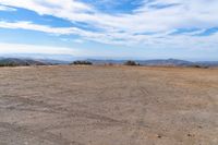 a lone motorcycle in an open desert field with the sky in the background with a couple of clouds above