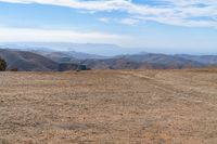 A breathtaking view of mountain slopes and open grass plains. The horizon stretches endlessly, as clouds float leisurely in the sky. From an overlook, see nature's beauty unfold. A person on a bicycle adds a touch of serenity to this picturesque landscape.