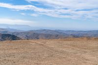 This is a breathtaking view from atop a dirt hill in a mountainous landscape. The open space provides an overview of the highland vegetation and plant community below. The dog in the image adds a sense of scale to the vastness of the horizon. The mountains in the distance create a stunning backdrop against the clear sky. The gravel surface of the hill adds a rugged and natural element to the scene. This photo captures the beauty of nature and the serenity of the mountainous terrain.