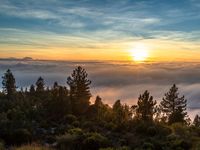 a very pretty view with fog in the foreground and the sun setting over the horizon