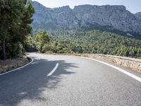 This image captures a scenic mountain road in Spain, located in the beautiful Balearic Islands. The asphalt road winds through a picturesque landscape with towering mountains, lush vegetation, and evergreen trees. The road surface is smooth and well-maintained, providing a safe mode of transport. As you travel along the road, you'll encounter curves and straight stretches, offering breathtaking views of the surrounding cliffs and hillsides. The Armco barriers provide added safety along the mountain pass. This photo showcases the stunning natural beauty and infrastructure of this European destination.