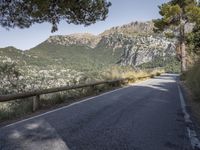 This is an image of a paved road running alongside a majestic mountain in Mallorca, Spain. The clear sky overhead enhances the beauty of the landscape. The road surface, made of asphalt, is bordered by a guard rail and an Armco barrier for safety. The lush trees and rocks add to the natural appeal of this highland area. This photo portrays a scenic mountain pass in Mallorca, one of the Balearic Islands in Europe.