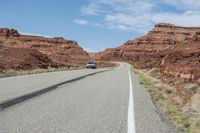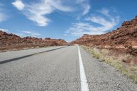 A low asphalt road winds through the desert, surrounded by red rock mountains and endless wilderness. The straight path stretches towards the horizon, crossing a mountain pass in a national park. The road surface, lane markings, and infrastructure blend seamlessly with the geology of the badlands.