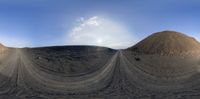 A breathtaking landscape with two hills and a circular picture of the earth from a unique perspective. The open space, mountain range, and grass surface create a stunning natural environment.