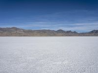 This photo captures the serene beauty of the desert landscape in Utah, USA. In the foreground, the snow-covered desert sand offers a striking contrast to the rugged mountains in the background. A solitary bench sits atop the dune, providing a peaceful spot to take in the view. The clear blue sky dotted with fluffy clouds adds to the tranquil atmosphere. This image represents the natural environment of Salt Lake City, with its unique combination of desert, mountains, and salt flats. It portrays a calm and tranquil day in this picturesque location.
