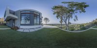 A stunning circular residence nestled in the mountains near San Diego, California, USA. This modern architectural marvel boasts expansive landscape views, surrounded by nature. The open floor plan and large windows flood the interior with sunlight, creating a seamless connection between the indoors and outdoors.