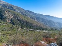 An aerial view of a winding road on the side of a lush green mountain. The elevated road provides an overlook of the stunning nature landscape, with mountains in the background under a clear blue sky.