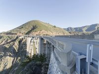 This is an image of a road trip through the mountainous highlands. The asphalt road winds through a scenic landscape, with mountains and a clear sky in the background. The road is supported by a viaduct, with a guard rail and a concrete bridge. This infrastructure provides a fixed link and allows for controlled access to the highway. The road curves through a mountain pass, surrounded by a stunning mountain range, possibly in the Alps. This photo captures the beauty of the highlands and represents a perfect day for a scenic road trip.