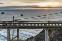 A scenic drive along the Pacific Coast Highway in Big Sur, California. The road stretches high above the coastal waters, offering breathtaking views of the ocean, mountains, and headlands. The sun is visible on the horizon, casting a warm glow on the landscape.