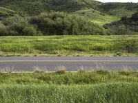A scenic road winds through the mountainous landscape of California, surrounded by lush green grass and wild vegetation. The clear blue sky and fluffy white clouds add to the natural beauty of this picturesque scenery.
