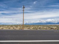 a telephone pole on the side of the road by the desert with mountains in the background