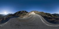 A winding road through the mountains, surrounded by lush vegetation and tall trees. The road curves down a hill, offering a breathtaking view of the mountain range. A perfect day for a road trip in the wilderness.