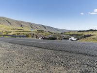 A scenic view of a road winding through the Icelandic highlands. The road surface is smooth asphalt, bordered by lush vegetation and towering mountains. Clear skies and a serene natural environment create the perfect landscape.