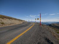 An asphalt road winds through a mountainous landscape, offering a scenic overlook of the surrounding nature. The clear sky sets the perfect backdrop for a day of recreational activities.