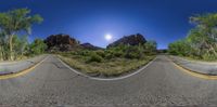 A motorcyclist rides along a winding mountain road, surrounded by breathtaking natural scenery. The clear sky and sunshine illuminate the rugged landscape, showcasing the diverse flora and vegetation of this wilderness area.
