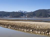 This is an image of a scenic coastal road in Shangri-La, Yunnan, China. The road winds through a lowland landscape surrounded by mountains and highlands. The view showcases the natural beauty of the area, with the ocean shore visible in the distance. The snowy mountains in the background create a picturesque winter scene. The clear sky reflects off the tranquil waters of the lake, adding to the serene atmosphere. This photo captures the untouched wilderness and natural environment of Shangri-La, making it a perfect representation of the region's stunning landscapes.