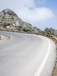 A picturesque view of a mountain road in Spain, winding through breathtaking scenery. The asphalt lane curves along the mountain pass, offering an overview of the stunning landscape and mountain range. Clouds hang above the Balearic Islands in the distance.