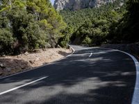 A scenic view of a winding road through the mountains of Spain. The asphalt road curves through the breathtaking landscape, surrounded by nature and woody plants. Clear skies and contrails above add to the picturesque scene. Explore the wilderness of the Balearic Islands in Europe.