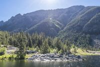 A rugged mountain road winds through a breathtaking landscape. The clear sky and visible sun create a stunning backdrop for the towering mountains and tranquil lake. Nature at its best.