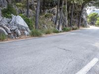 a motorcycle is going down a road in the woods on a mountain side side near some rocks