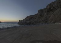 A scenic coastal landscape in Portugal during dawn. The dark ocean meets the clear sky at the horizon. The rugged bedrock terrain is contrasted by the smooth concrete boat ramp. A perfect open space to enjoy nature.