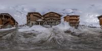 a group of buildings surrounded by snow on a mountain slope with trees in the background
