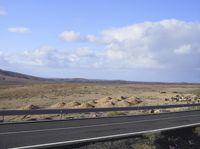 an asphalt road running through a desert area on a sunny day with blue sky and clouds in the background