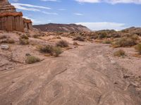 a dirt road surrounded by a big rock formation in the desert, with a blue sky overhead