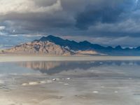 Vast open space in Salt Lake City, Utah. The desert landscape showcases mountains and the Salt Lake. Sun visible against a clear sky, with sunshine highlighting the nature of this sunny day.