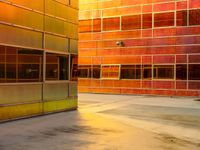 an industrial building with orange colored windows, with rain falling on the floor, along with a bench to sit out front
