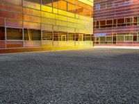 A modern office building in the business district of Holland, Netherlands. The multicolored facade with rectangular windows stands out against the urban design. The day sky creates a vibrant contrast with the composite material construction.