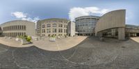 a panoramic view of the outside of a museum and building from the front