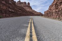 A narrow paved road winds through the rugged and rocky terrain of Utah's desert landscape. The straight road disappears into the distance, surrounded by red rock formations. The clear blue sky above contrasts with the gloomy and grey landscape below.