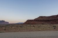 This is an image of a rugged and rocky terrain at dawn in a desert wilderness. A dirt road winds through the highland landscape, surrounded by mountains and plateaus. The clear sky above and the horizon in the distance provide a picturesque view. The geology of the area is visible with the formation of escarpments and badlands. Gravel can be seen scattered across the terrain. This photo represents the beauty and serenity of a remote desert landscape in a national park.
