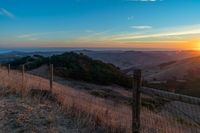 there is a sunset in the horizon on a field with grassy land below the mountains